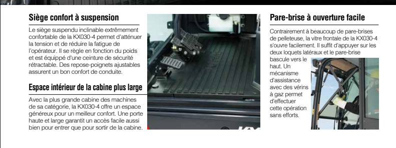 La KX030-4 est équipée de série d’une gamme complète de dispositifs de sécurité, depuis les systèmes ROPS/OPG jusqu’aux points de fixation des protections de la vitre avant, en passant par une porte d’accès et un capot à ouverture totale.